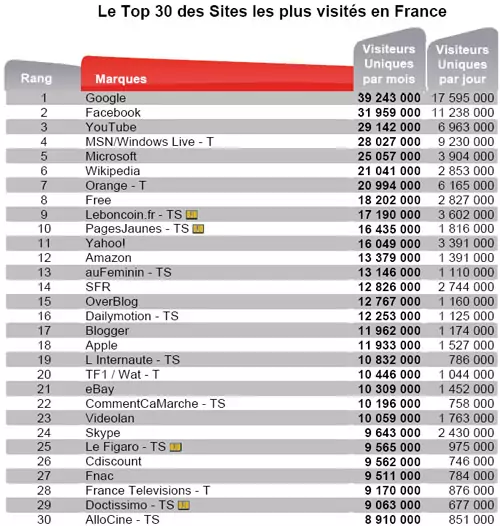 Médiamétrie vient de publier le classement des sites web les plus visités en novembre. On constate peu de changement dans le peloton de tête, où l’on retrouve Free en 8ème position. Précisons qu’il s’agit de la 4ème édition du nouveau système de mesure de Médiamétrie qui n’était auparavant basé que sur des sondages. Dorénavant, l’audience de certains sites est certifiée par l’OJD et reprend donc l’audience réelle de ces derniers. Les autres sites sont pondérés en fonction des sites certifiés et du sondage représentatif.