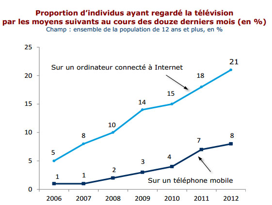 Autre information, une personne sur cinq regarde la TV sur un ordinateur connecté à internet (soit 11 millions de personnes). Ce sont surtout les jeunes (40% des 12-17 ans vs 18% des 40-59 ans). 8% utilisent le mobile (4 millions de personnes). C’est finalement le service recensé le moins pratiqué depuis un mobile.
