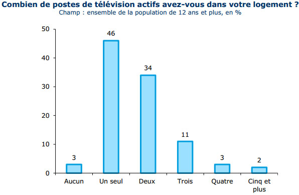 Cette étude du Conseil Général de L’économie publiée par l’ARCEP montre que 97% de la population a accès à la télévision à son domicile via un poste de TV. La majorité (50%) dispose d’au moins deux postes de télévision dans le foyer et 46% n’a qu’un seul poste.