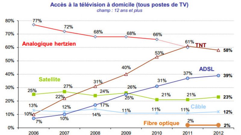 En 2003, Free était le premier opérateur à lancer la télévision par ADSL. En 2008, ce mode de réception dépassait le câble, pourtant installé en France depuis les années 80. En 2010, la TV par ADSL dépassait le satellite et n’a fait que confirmer, depuis, son statut de premier mode de réception pour la télévision payante. La dernière étude que vient de publier l’ARCEP, montre que la TV par ADSL a continué à progresser en 2012, avec 39% des foyers qui reçoivent la télévision via leur box, soit 2 points de plus qu’en 2011. Dans le même temps, la TNT, le 1er mode de réception toutes technologies confondues, perd 3 points, avec 58% des foyers utilisateurs.