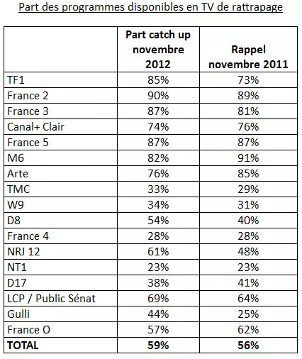 D’après l’étude réalisée pour le CNC par www.tv-replay.fr, 59% des programmes diffusés entre 17h et minuit sur les chaînes de la TNT sont proposés gratuitement aux internautes sur leurs sites de TV de rattrapage. En novembre 2011, la part était de 56%.