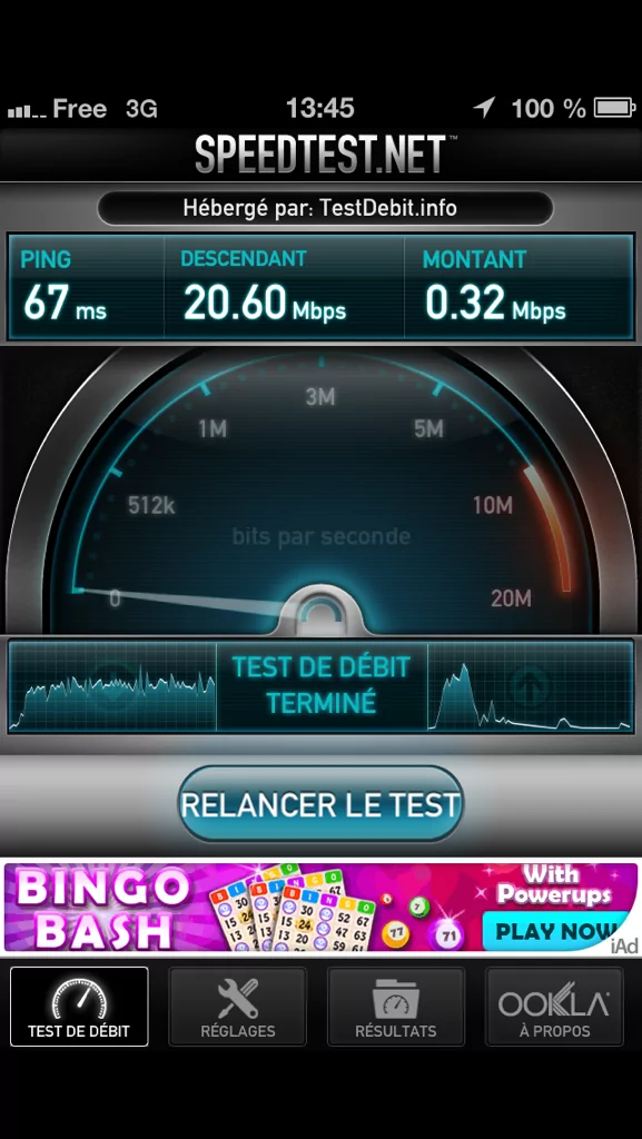Chez Free Mobile, le débit maximum théorique annoncé en réception est de 14 Mbits/s. Pourtant un abonné Free Mobile a mesuré aujourd’hui des débits dépassant les 20 Mbits/s ! Les tests présentés ont été effectués par @Anarion288 sur un iPhone 5 sous iOS 6.0.2 et sur une antenne Orange à Pau (64).