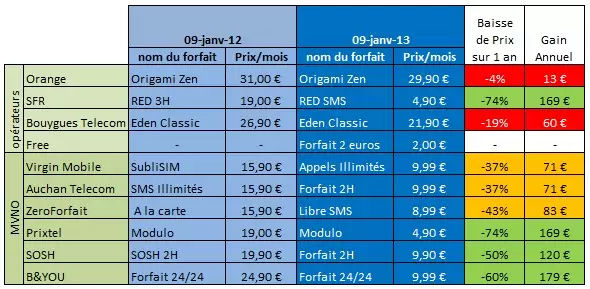 Il y a un an jour pour jour, Xavier Niel promettait de diviser la facture téléphonique des français pas 2. Le site le bon forfait publie ce jour un comparatif des forfait réalisé le 10 janvier 2012 et un autre réalisé ce jour.