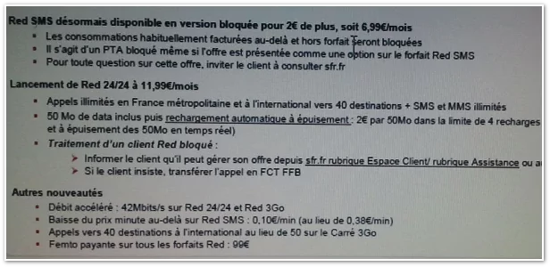 Le forfait « RED SMS » à 4,99 euros par mois subit également quelques modifications. Les consommations facturées hors forfait pourront être bloquées pour 2 euros par mois (soit 6,99 euros par mois) et le prix des communications facturées hors forfait baisse de 0,38€/mn à 0,10€/mn. La note indique qu’il s’agit bien d’un nouveau forfait bloqué – PTA bloqué, autrement dit forfait bloqué – même s’il doit être présenté comme une option aux clients.
