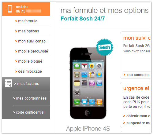 L’espace dédié aux abonnés est très sobre et regroupe les principales informations et rubriques utiles à la bonne utilisation de son abonnement (mes factures, mes coordonnées, ma formule, déblocage du mobile si ce dernier a été acheté chez Orange, etc). De nombreuses options gratuites ou payantes (plus ou moins intéressantes : TV Mobile d’Orange, assurances pour smartphones, etc) sont proposées.