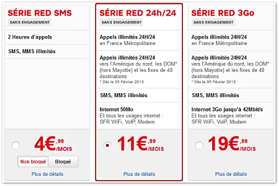 Comme nous vous l’avions annoncé, la formule RED SMS à 4,99 euros par mois propose désormais une "option" pour bloquer les communications hors forfait pour 2 euros par mois (soit 6,99 euros par mois). En réalité, un nouveau forfait bloqué d’après le document interne de SFR.