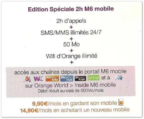 L’opérateur est sur le point de lancer une nouvelle offre incluant 2 h d’appels, les SMS/MMS illimités, 50 Mo de DATA, le WiFi en illimité via les hotspots WiFi Orange et un accès à certaines chaînes TV (M6, W9, M6 Music Hit, M6 Music Black, M6 Music Club, Téva et M6 Replay) depuis le portail M6 Mobile. La consultation est limitée à 500 Mo/mois.