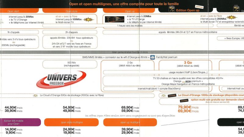 Orange propose également une Edition Spéciale Open Up 4G/H+ à 79.90€ par mois et Open Top 4G/H+ à 89,90 € par mois avec option Multi-SIM (5€ de frais de mise en service). Cette dernière comprend en plus les appels illimités vers les mobiles depuis la box, les appels illimités vers les fixes en Europe, USA, Canada…), et un fair use de 3 Go pour Open Up 4G/H+ et de 5 Go pour Open TOP 4G/H+. En version SIM : 89,90€ par mois (engagement 24 mois et SIM sans engagement) ou 79,90€ par mois (engagement de 12 mois) : Livebox play 19€, décodeur 39€, l’ensemble 49€ (lecteur blu-ray en option payante).