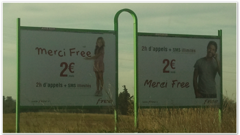 Depuis quelques jours, Free habille les espaces publicitaires d’Avignon et d’Orange (la ville), avec de nouvelles affiches publicitaires pour Free Mobile. Celles-ci mettent en avant le nouveau ton de Free Mobile : « Merci Free » et le forfait mobile à 2 euros par mois incluant 2h d’appels et les SMS en illimité (ou 0€ par mois pour les Freenautes).