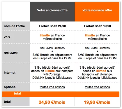 Les débits plus élevés (pouvant atteindre 42 Mb/s en réception et 5,8 Mb/s en émission) et les avantages de la technologie H+ (ou HSPA+ Dual Carrier) sont réservés aux abonnés Sosh 3Go à 24,90 euros par mois.