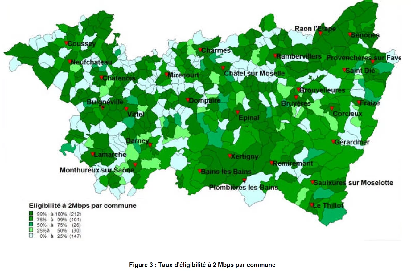 Pour autant le territoire Vosgien qui est déjà fortement touché par la fracture numérique.De nombreuses communes disposent encore de zones à moins de 2 Mbits ne permettant pas pour les abonnés de diposer des offres triple play. La majorité des logements ne dépassent pas les 8 Mbits.