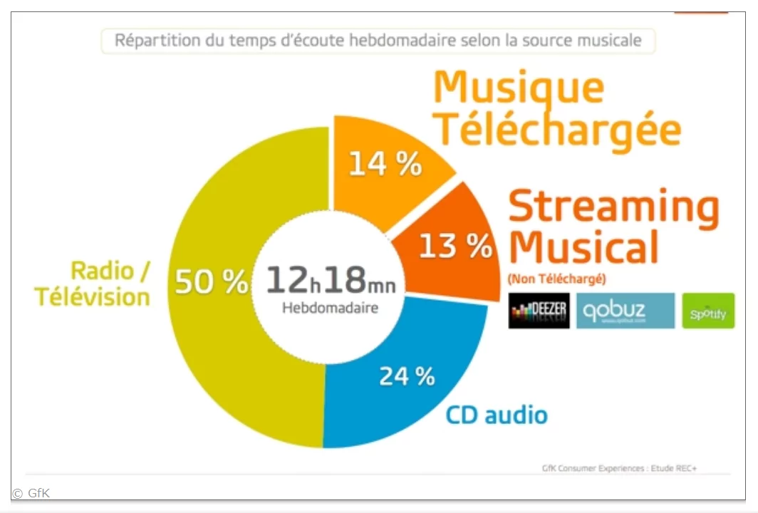 Il se retrouve dépassé par la musique dématérialisée ( Streaming+ téléchargement) qui représente ensemble 27 % du temps d’écoute.