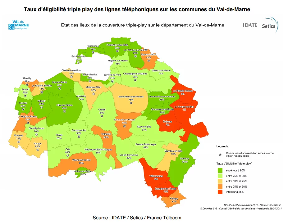 Néanmoins, le réseau câblé Numéricable dispose d’un réseau qui couvre 27 communes soit 356 000 prises raccordables à un débit minimum de 30 Mbps. Les villes de Charenton, Créteil, Joinville, Saint Maur, Saint Maurice, Saint Mandé et Vincennes pourraient rapidement être éligible à un réseau 100 Mbps en cas de simple mise à niveau du réseau