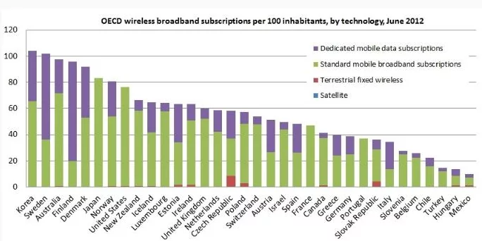 La France se classerait 22ème sur les 34 pays de l’ OCDE en terme de taux de pénétration haut débit sans-fil avec 46,9 connexions haut-débit sans fil pour 100 habitants. (dont 46,7 pour l’internet mobile). D’autres pays européens comme l’ Italie, le Canada, l’Allemagne ou la Belgique, tous moins bien classés que la France. Le taux de pénétration moyenne des pays de l’OCDE est de 56 % et plus de 700 millions d’abonnements. La Corée et la Suède disposent même de plus d’abonnements sans fil que d’habitants.