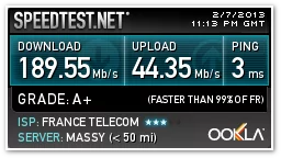 Dans un autre billet, les mesures obtenues à l’aide de l’outil Speedtest montrent un débit de 189 Mb/s en réception et 44 Mb/s en émission. Le temps de réponse (ping) est excellent avec 3 ms.