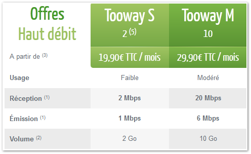 « Tooway M » à 29,90 euros par mois : Ce forfait est destiné à un faible modéré. Il inclut un accès internet à 20 Mb/s en réception et 6 Mb/s en émission pour 10 Go de volume de DATA (émission et réception). Au delà de ce quota, les vitesses du débit d’émission et de réception sont ramenées à un débit maximum de 128 Kb/s en émission et 256 Kb/s en réception.