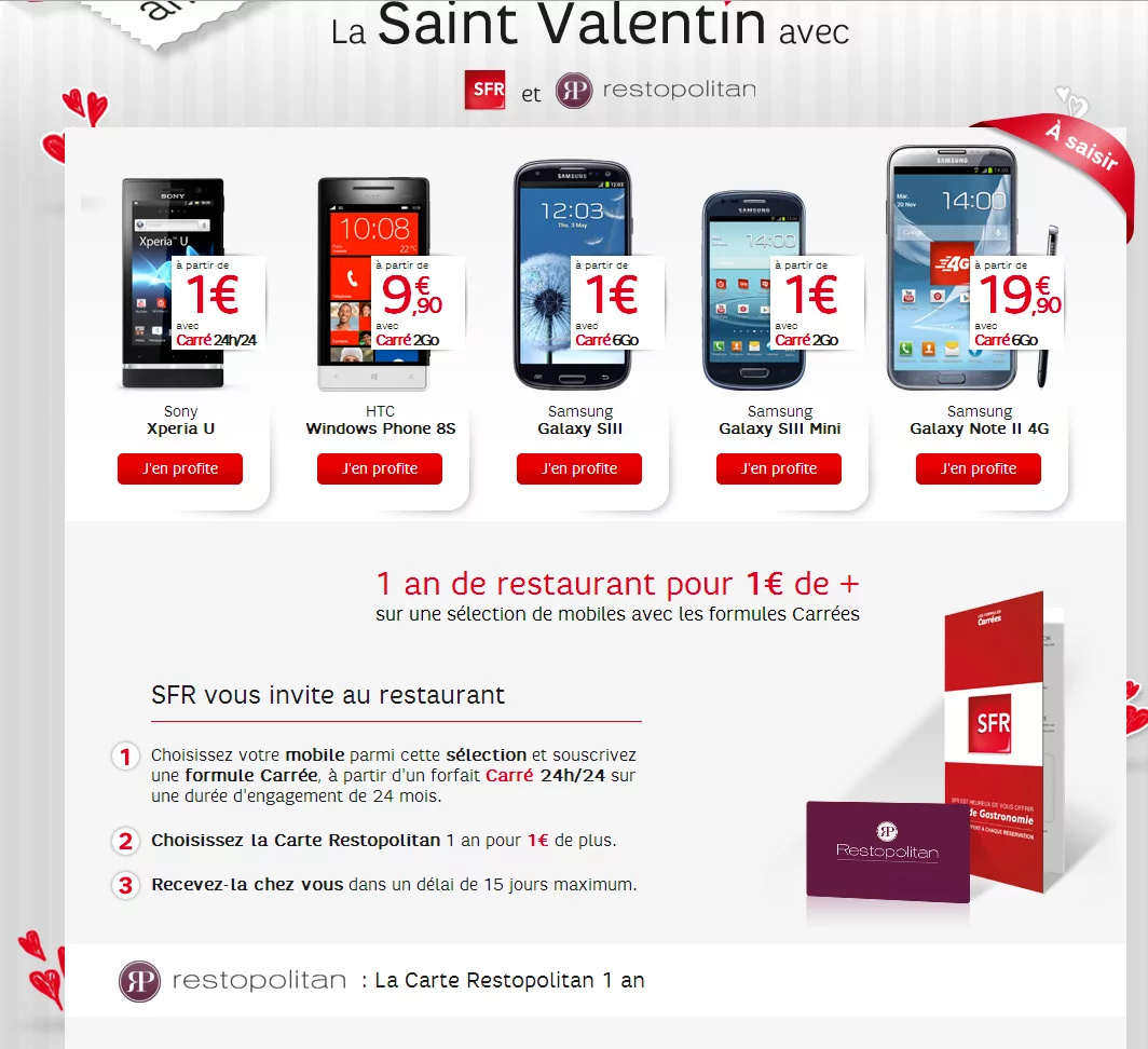 A ce prix là et cet engagement là, SFR peut bien vous payer "le resto". C’est ainsi qu’il annonce à l’occasion de la Saint-Valentin, un an de restaurant avec la carte Restopolitan pour 1 € de plus.