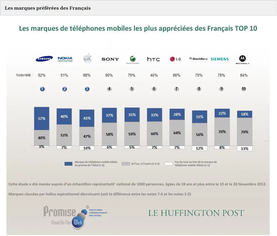 Une étude du cabinet Promise Consulting Inc / Le Huffington Post vient de s’intéresser aux mobiles préférés des Français. D’après un panel de 1000 personnes interrogés selon la méthode des échantillons. Les personnes interrogées ont attribué une note de 1 à 7 aux marques de mobiles qui leur étaient proposées. Aucun critère n’était imposé. Cette étude ne révèle donc pas s’il s’agit des performances, de l’esthétisme, la gamme de prix ou l’ergonomie qui oriente leur choix.