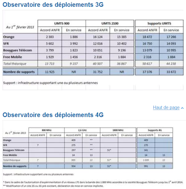 L’Agence Nationale des Fréquences publie ce jour les enregistrement des déclarations des stations 3G/4G. Au 1ere février 2013, l’ ANFR références 37376 antennes en 3G et 954 en 4 G.