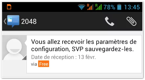 Depuis 48 heures, un certain nombre d’abonnés Free Mobile reçoit un SMS provenant du numéro court 2048, leur indiquant : « Vous allez recevoir les paramètres de configuration. S’il vous plait, sauvegardez-les, ». Ce SMS est transmis par Free. Il permet de récupérer les derniers réglages de l’opérateur.