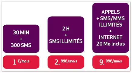 La première offre inclut 30min d’appels et 300 SMS pour 1€/mois. La seconde offre inclut 2 heures d’appels vers les fixes et mobiles en France et les SMS illimités pour 2,99€/mois (à peine 99 centimes de plus que l’offre à 2€/mois de Free Mobile) mais le hors forfait voix s’élève à 0,37€/mn (8mn de hors forfait équivaut au prix du forfait à 2,99€/mois) et les MMS sont facturés 0,30€/MMS.