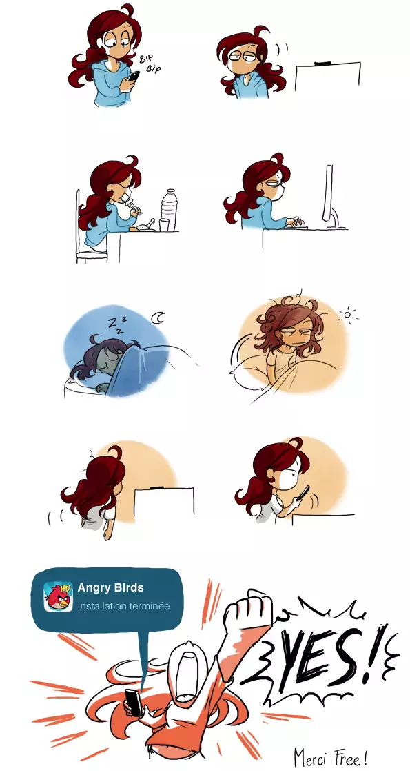 Fin Janvier, Yatuu, jeune illustratrice talentueuse et auteure de bandes dessinées, a immortalisé ses difficultés à télécharger une application sur l’Appstore avec son forfait Free Mobile. Yatuu conclut ironiquement cette illustration par le slogan accompagnant les nouveaux spots publicitaires de l’opérateur. Mordant.