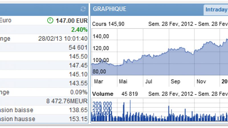 Mise à jour (28/02/2013 à 14h45) : Le titre atteint désormais 151,45 € (+5,50%) !