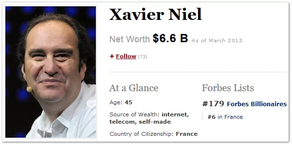 Avec 5,07 milliards d’euros (6,6 milliards de dollars), le directeur chargé à la stratégie du Groupe Iliad, Xavier Niel est la 179ème personnalité la plus riche au monde dans le classement annuel du magazine américain Forbes. Il fait un bond de 118 places (297ème en 2011 avec une fortune estimée à 3,7 milliards).