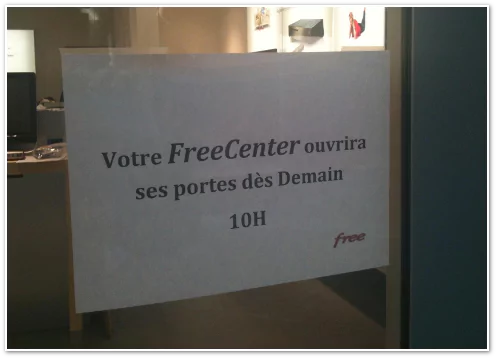 Initialement prévue aujourd’hui à 17h, l’ouverture du Free Center à Limoges est repoussée d’une petite journée (certainement suite à petit retard dans la préparation). Le Free Center ouvrira finalement ses portes aux abonnés et/ou futurs abonnés, dès demain à 10h, comme en atteste cette photo prise par Samet, un abonné et lecteur d’UniversFreebox : « Votre Free Center ouvrira ses portes dès demain 10h ».