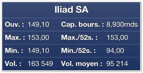 Le titre du groupe Iliad, maison-mère de Free, connait actuellement une nette augmentation sur les places financières. Il atteint plus de 152 euros, en hausse de 2,83% (153 euros en séance). L’action du Groupe explose ainsi un nouveau sommet historique. Le titre s’était envolé à 151,7€ lors de la publication du chiffre d’affaires, le 28 février dernier. Le groupe Iliad est quasiment valorisé 9 milliards d’euros (8,930 milliards).