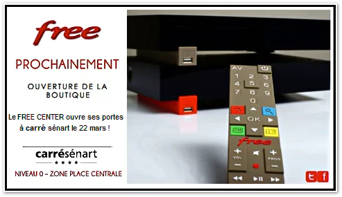 Le Free Center du centre commercial Carré Sénart ouvrira ses portes le 22 mars prochain à 10h. Ce nouvel espace dédié à Free et à Free Mobile est placé dans la zone Centrale, au niveau 0. Les horaires de fermeture n’ont pas été précisés mais ils devraient être similaires à ceux de son grand frère de Rosny 2. Ce dernier fait également partie d’un centre commercial et il est ouvert le lundi de 10h à 20h et du mardi au samedi de 10h à 21h.