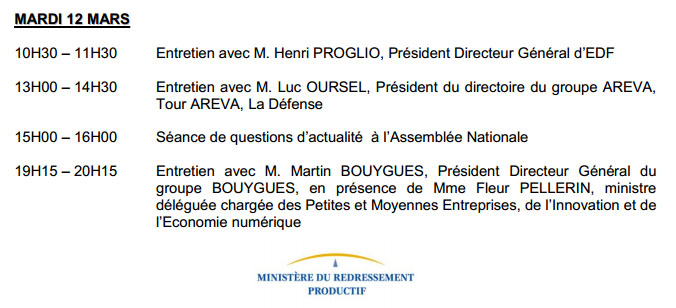 Or ces propos n’interviennent pas à n’importe quel moment. En regardant l’agenda d’Arnaud Montebourg, on constate que celui-ci a reçu Martin Bouygues mardi soir, la veille de la tribune, en présence également de Fleur Pellerin. «Mardi 12 mars, de 19h15 à 20h15 : Entretien avec M. Martin BOUYGUES, Président Directeur Général du groupe BOUYGUES, en présence de Mme Fleur PELLERIN, ministre déléguée chargée des Petites et Moyennes Entreprises, de l’Innovation et de l’Economie numérique » peut on lire sur l’agenda du Ministre.