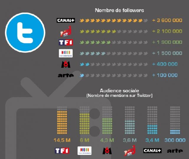 Du côté de Twitter, on retrouve Canal+ et ses 3,6 millions de "followers", mais largement surpassé par TF1 qui malgré 1,9 millions de "followers" et "twitté" et "sur-twitté" avec 14,4 millions de mentions.