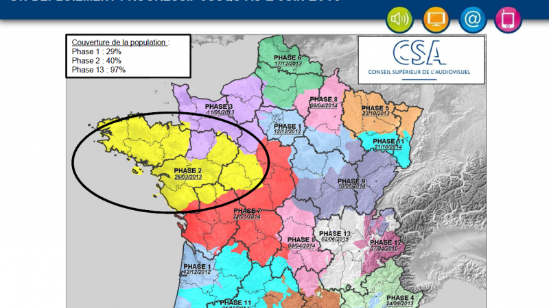 Emmanuel Gabla, membre du Conseil, a présenté, le jeudi 14 mars à Nantes, l’arrivée des six nouvelles chaînes HD de la TNT le 26 mars 2013 en Pays-de-la-Loire et en Bretagne, en présence des représentants du groupement des chaînes Toute la TNT et de l’Agence nationale des fréquences (ANFR).