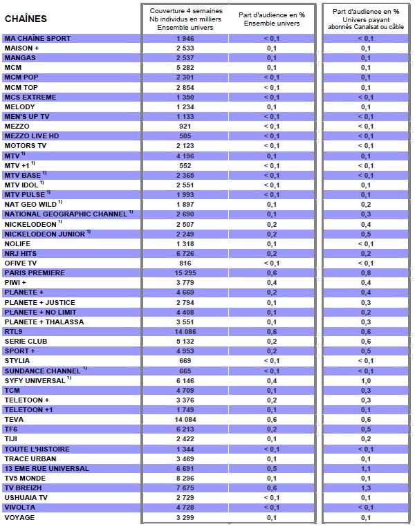 En queue de peloton avec moins de 0.1% de part d’audience on retrouve parmi beaucoup d’autres : Vivolta, , Toute L’Histoire, MTV Pulse, Motors TV, Mezzo, Ma Chaîne Sport , Mcm Pop, Stylia et Escales qui restent à la même place ainsi qu’ Ushuaia TV et Ma Chaîne Sport qui ont régressées.