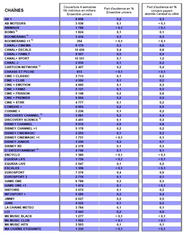 Disney Channel culmine largement en tête du classement. Par rapport à la dernière étude, elle reste leader avec une part d’audience de 0.9%. Canal + Sport reste toujours à la deuxième place avec 0.7% Sur la troisième marche du podium on retrouve à égalité TV Breizh, Téva, RTL9 et Paris Première Universal avec 0.6%. Ces quatre chaînes perdent 0.1% depuis la dernière fois. Un peu plus loin derrière, Canal + Family , et 13ème Rue (qui ne bougent pas) avec 0.5% de part d’audience se placent juste devant Canal Plus Décalé qui reste à la même place avec 0.4% et Eurosport qui bien qu’elle figure toujours dans le top 10 connait la plus grosse perte d’audience avec 0.4% à l’heure actuelle contre 0.6% il y a environ six mois.