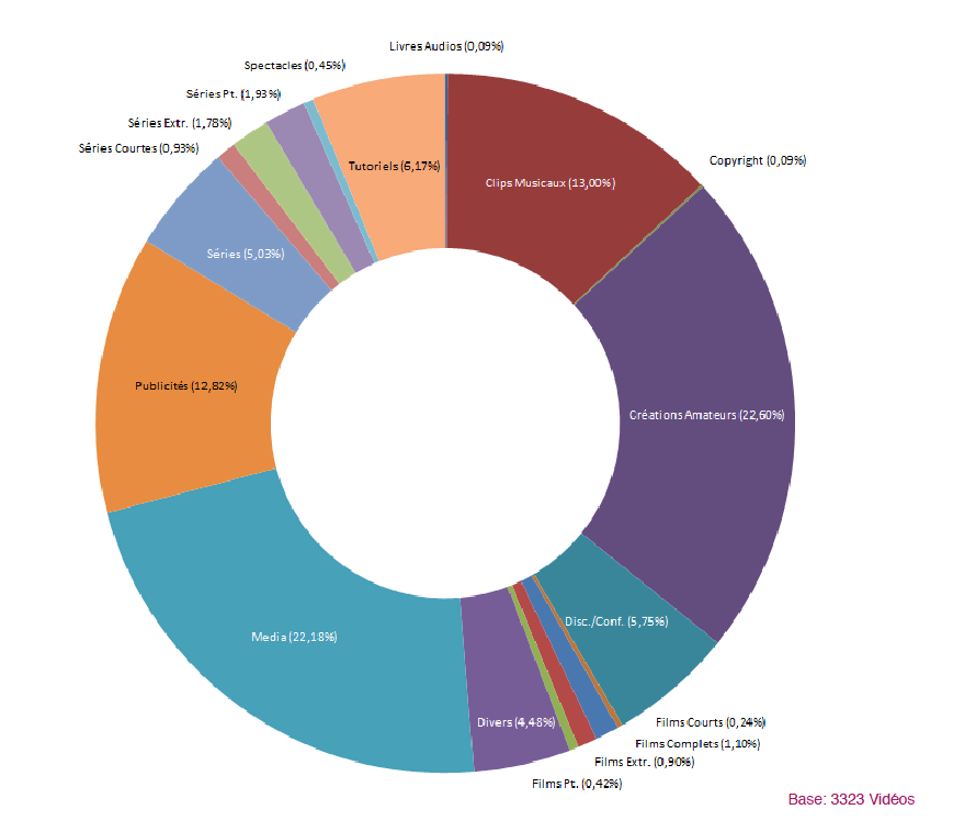 Sur un échantillon de 3323 vidéos, une majorité de vidéos sont issues de créations amateurs, de clips musicaux et de contenus issus des média. Ces trois catégories représente à elles seules plus de la moitié des contenus proposé par Youtube.
