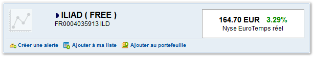 Le buzz lancé par Xavier Niel, dont nous vous faisions l’écho ce matin, s’est propagé aux marchés financiers et a permis à l’action du groupe Iliad d’atteindre un nouveau sommet historique. Le titre commence bien la semaine en atteignant 164,70 euros (en hausse de 3.29%). Les performances de l’action Iliad permettent au Groupe d’être valorisé plus de 9,464 milliards d’euros. Ces mouvements financiers sont généralement observés lors de l’annonce des résultats du groupe Iliad ou lors du lancement d’un nouveau service.