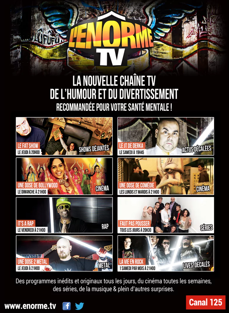 Info Univers Freebox. Nous vous rapportions mardi une affiche de l’Enôrme TV stipulant son arrivée sur le Freebox pour avril. Nous avons aujourd’hui pu obtenir la confirmation de Free quant à l’arrivée de la chaîne dédiée à la musique et à l’humour, en avril sur le canal 125 de Freebox TV. Mieux, l’opérateur nous indique qu’elle sera proposée gratuitement pour les Freenautes !