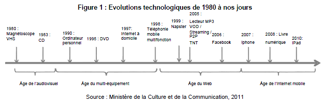 La Hadopi note ainsi quatre phase dans l’évolution des pratiques de partages la première correspondant à l’apparition de la VHS et de la cassette audio (1980-1985) et le partage de proximité (amis et famille). La periode 1986-1998 se traduit par l’arrivé du compact disque et DVD, les prémices d’internet. Entre 1999 et 2006, le MP3 et la généralisation de l’internet en ADSL, conduisant à l’accès à la culture à distance et le partage de bien culturel sur internet. Enfin depuis 2007 le début du très haut débit, du wifi, de l’internet mobile, des livres et de la télévision numérique. La culture à la demande se développe sur des nombreux supports a distance. Les partages sont facilités dans de nombreuses sphères proches ou à distance.