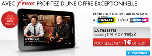 Canalsat/Canal+ lance une nouvelle offre promotionnelle destinée aux abonnés Freebox. Pour tout abonnement à CANAL+ et/ou à CANALSAT avec les 2 packs Panorama et Séries Cinéma chez Free du 2 au 29 avril, une tablette Samsung Galaxy Tab™ 2 7.0 (Wi-Fi) 8GB 2 est proposée à 1 euro de plus, dans la limite de 4000 tablettes disponibles.