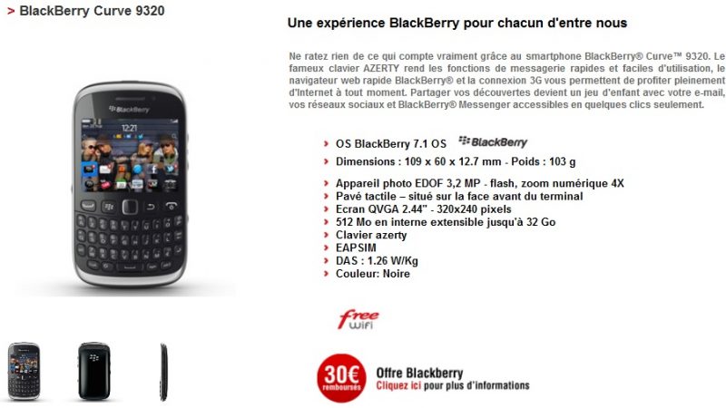 Pour tout achat d’un Blackberry Curve 9320 entre le 02 avril et le 30 avril 2013, vous devrez renvoyez le coupon de remboursement de 30 € disponible à cet adresse. Le téléphone coûte actuellement 178,60 € en une seule fois ou à 46,60 € à la commande et 44 €/ mois sur 3 mois.