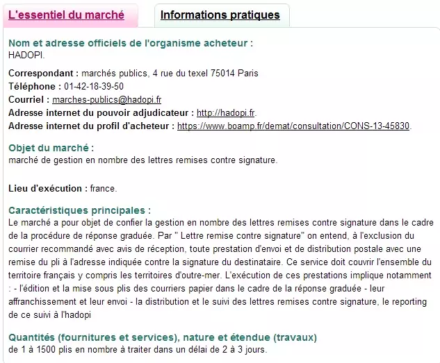 La Hadopi cherche ainsi un sous-traitant pour gérer impressions et envois de courrier dans le cadre de la riposte graduée. Les accusés-réception de La Poste étant trop onéreux, la Haute Autorité dispose d’un budget de 300 000 € pour l’envoi de 1 à 1500 courriers dans un délai de 2 à 3 jours pour des courriers devant être remis en main propre contre signature.