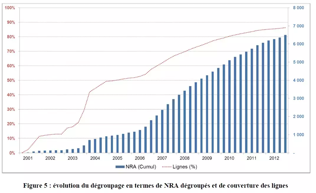 Si jusqu’en 2005, les opérateurs ont d’abord couvert les plus grandes agglomérations permettant de toucher près de 50 % des lignes dès la fin du premier cycle de dégroupage. Les opérateurs se sont ensuite attaqués aux zones moins denses nécessitant le dégroupage de plus de NRA, jusqu’à atteindre fin 2012, 86.3 % des lignes et plus de 6000 NRA dégroupés.