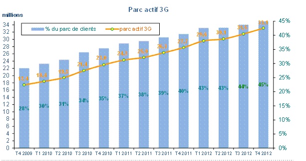 A l’heure du déploiement et des prémices de la 4G, le bilan du 4 ème trimestre 2012 de l’ARCEP ne référence pas encore l’utilisation de la 4G, le parc d’abonné étant encore trop faible en 2012. Pour autant le parc 3G est encore en plein développement avec 45,3% du nombre total de clients aux services mobiles utilisent la 3G. Pour le seul trimestre 2012, l’ARCEP recense 1.6 millions d’utilisateurs supplémentaires. Pour autant les 3/4 de la croissance du quatrième trimestre est imputable aux cartes SIM internet prépayées souvent utilisées pour les tablettes.