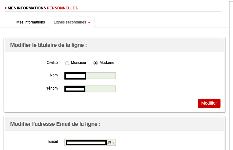 Ensuite, Free Mobile permet maintenant de modifier les titulaires des comptes secondaires. Pour cela, il suffit de vous rendre dans la rubrique « Gérer mon compte » > « Mes informations » puis cliquer sur l’onglet « lignes secondaires »