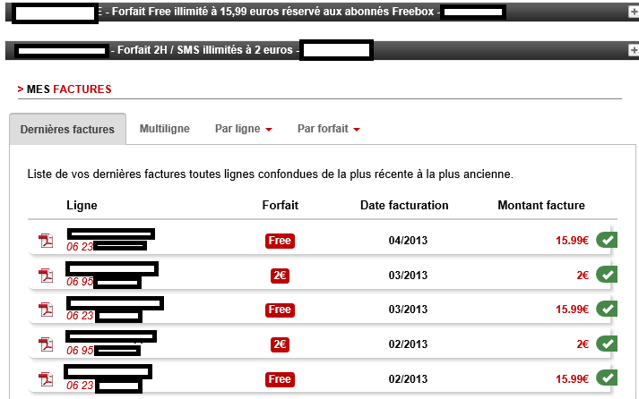 Free Mobile vient d’améliorer l’espace abonné disponible en ligne. Tout d’abord, une nouvelle présentation des factures est disponible. Celles-ci sont maintenant triées par ligne, forfait, et multiligne.