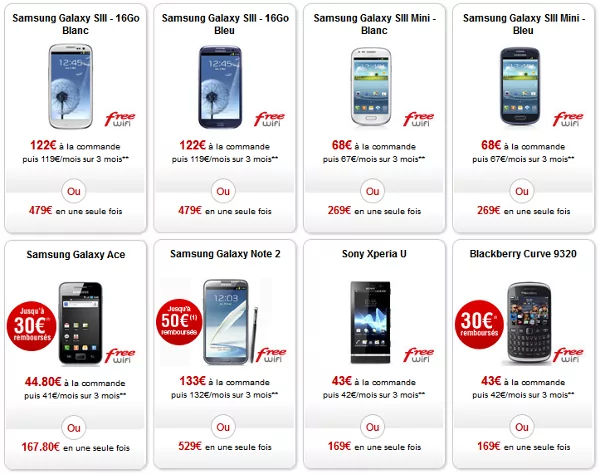 Par ailleurs, comme nous vous l’avons indiqué récemment, le Blackberry Curve bénéficie d’une offre de remboursement de 30 euros tout comme le Samsung Galaxy Ace. Le Samsung Galaxy Note 2 bénéficie quant lui d’une offre de remboursement de 50 euros. Rappelons également que Free vous offre une seconde coque gratuite via ce formulaire pour le Nokia Lumia 620 et une housse en cuir est offerte pour l’achat d’un LG Optimus 9.