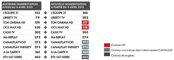 La nouvelle numérotation de Canalsat et les nouvelles chaînes HD sont disponibles depuis ce matin sur la Freebox. Vous pouvez retrouver le tableau récapitulatif de la nouvelle position des chaînes ci-dessous.