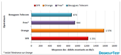 En envoi de données, les tests effectués depuis une connexion Orange affichent une moyenne de 1,58 Mb/s. Le débit montant moyen constaté chez SFR est de 1,23 Mb/s tandis qu’il atteint 944 kb/s chez Free. Les connexions Bouygues Telecom totalisent une moyenne de 873 kb/s.